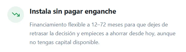 Con financiamiento sin enganche instalas hoy sin pagar nada y comienzas a ahorrar desde el primer mes. El ahorro en tu recibo de luz puede cubrir el pago mensual del sistema.