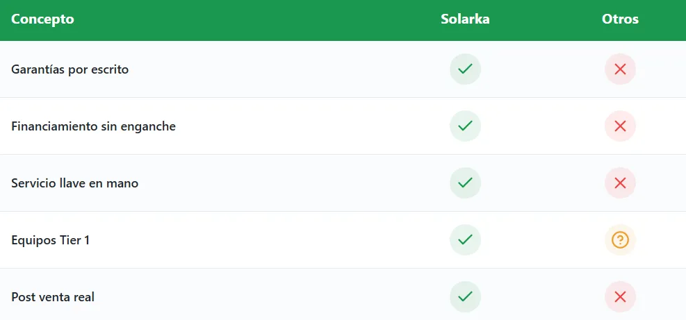 Las garantías de fábrica y montaje están documentadas y se gestionan directamente con Solarka. Nuestros equipos Tier 1 tienen garantías de hasta 25 años en paneles y 10 años en inversores.